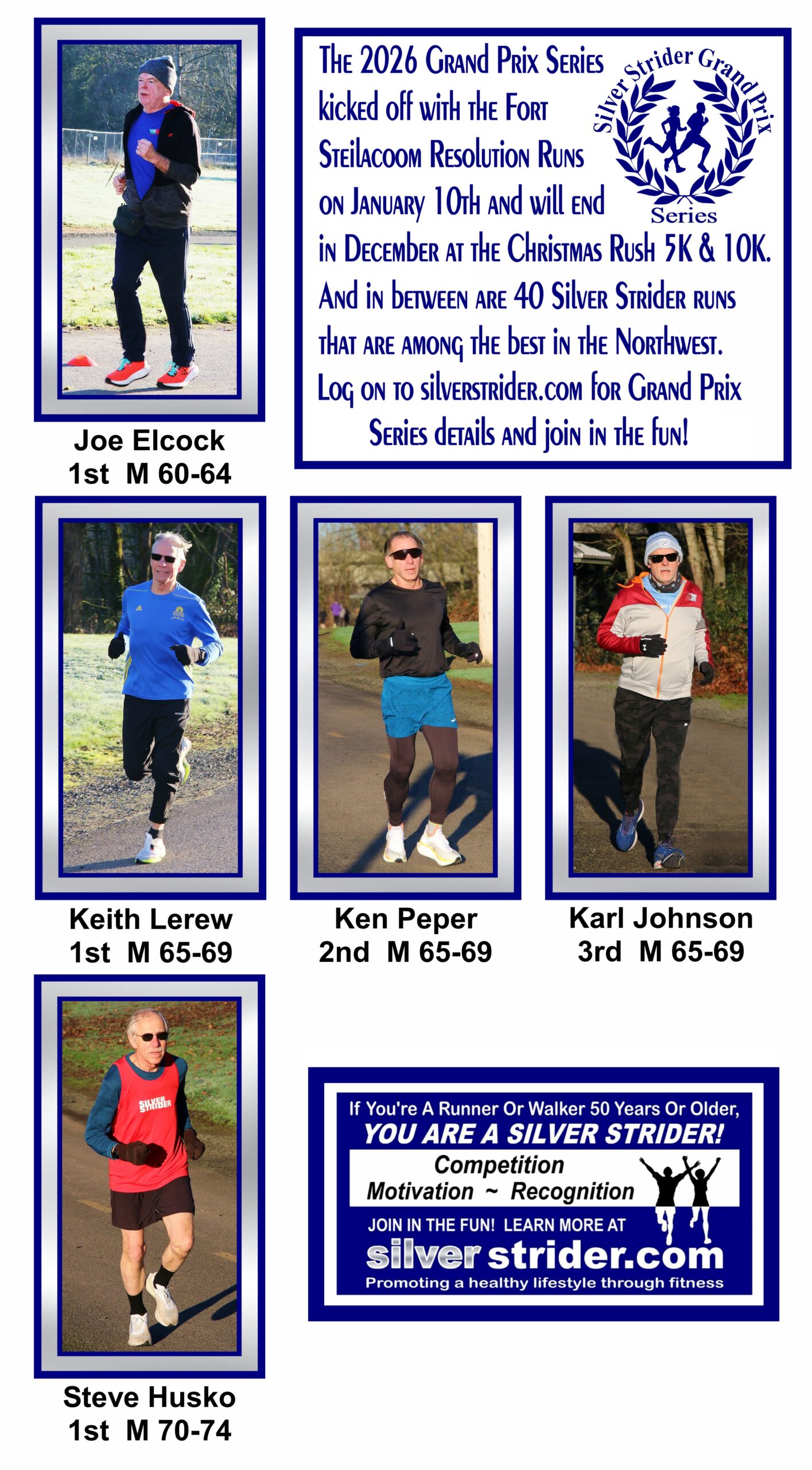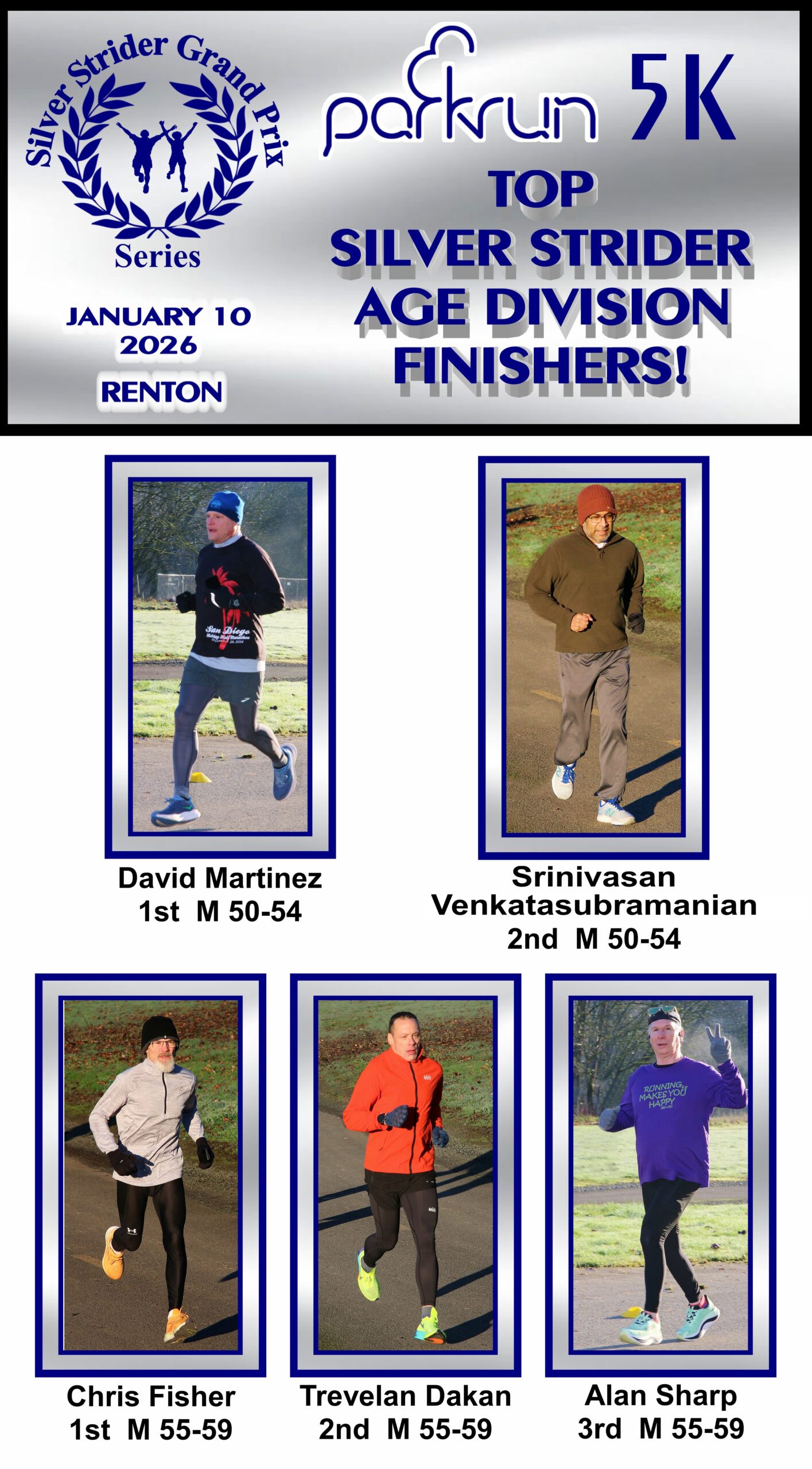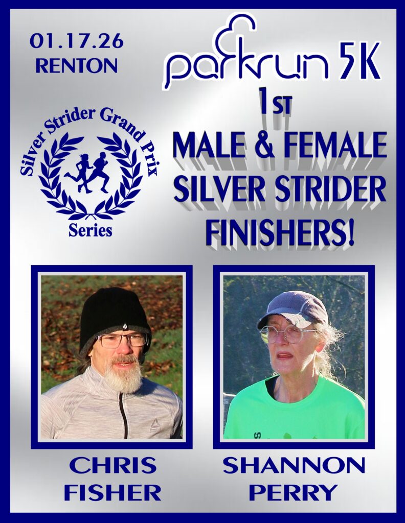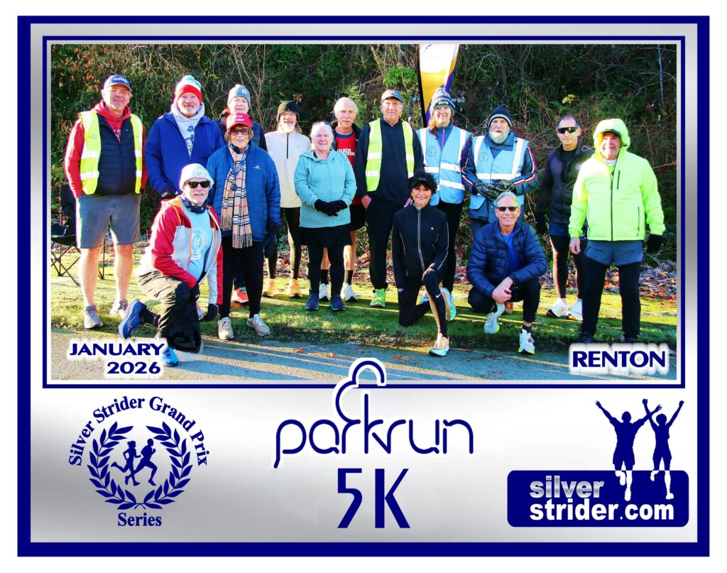 Jerry’s notes: I will start the qualifications for 2026 Ambassadorships on February 7th at the FSRC Resolution Run #2. The reason being I didn’t give everyone notice that the Ambassador program would continue in 2026. In addition, runners at Renton were so bundled up in the photos, I couldn’t tell who might be wearing Silver Strider shirts. I will have shirts and hats for anyone who needs them.