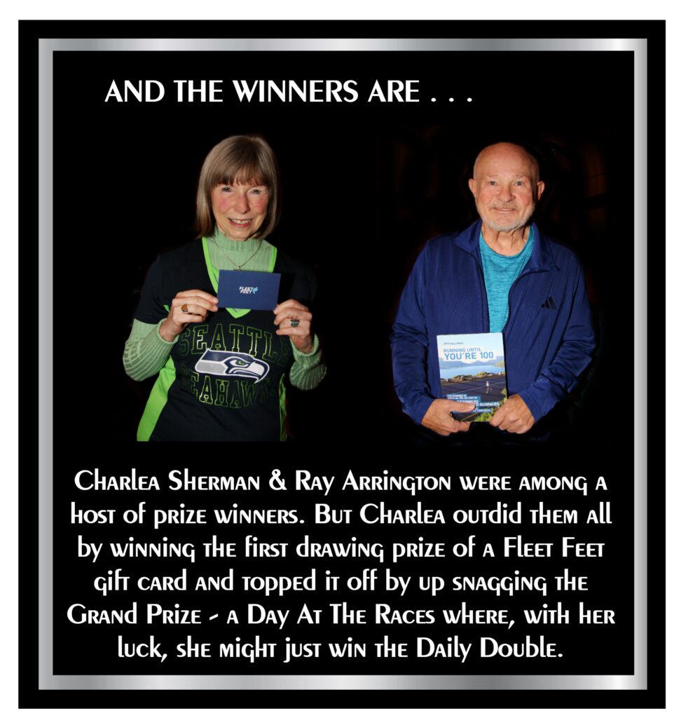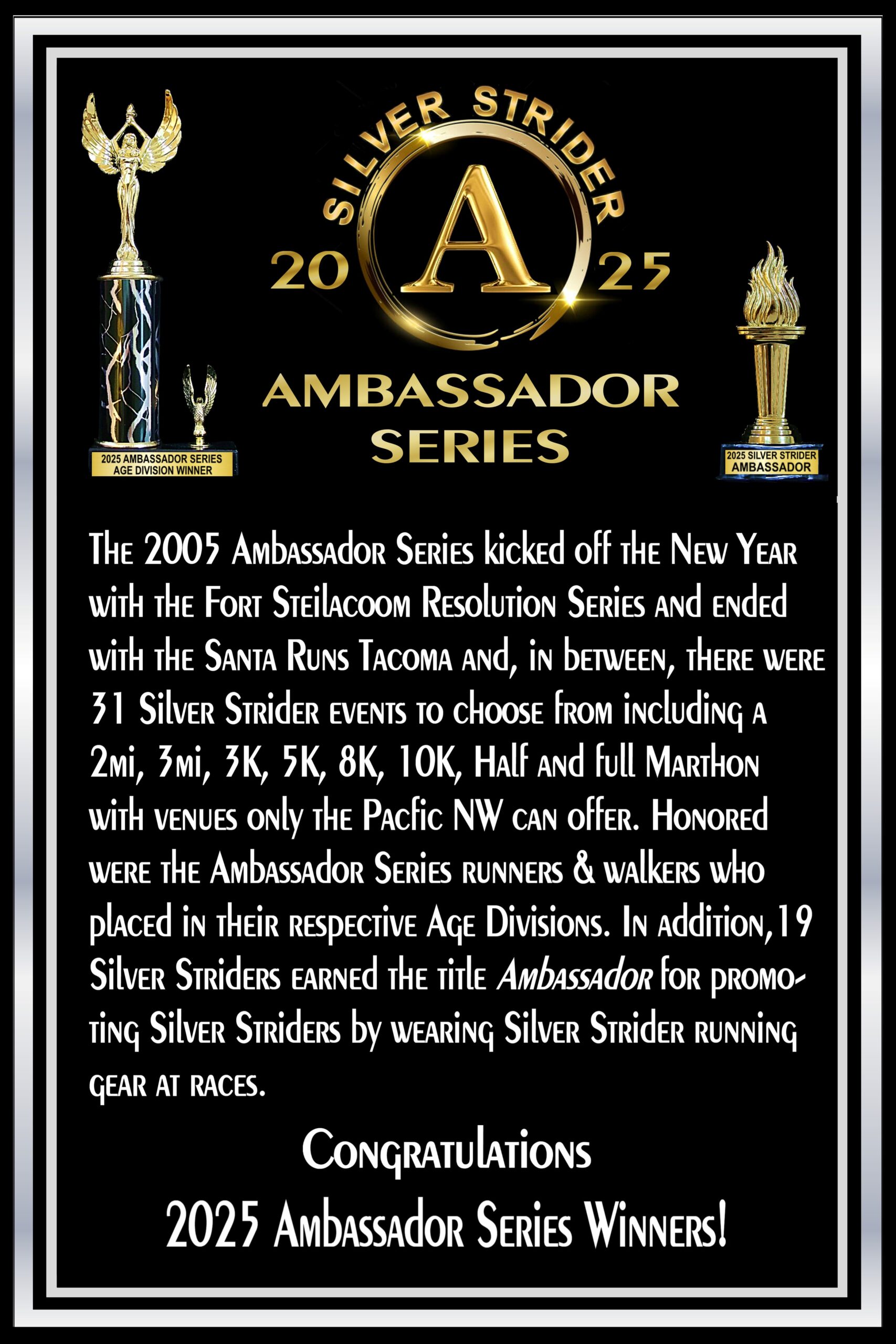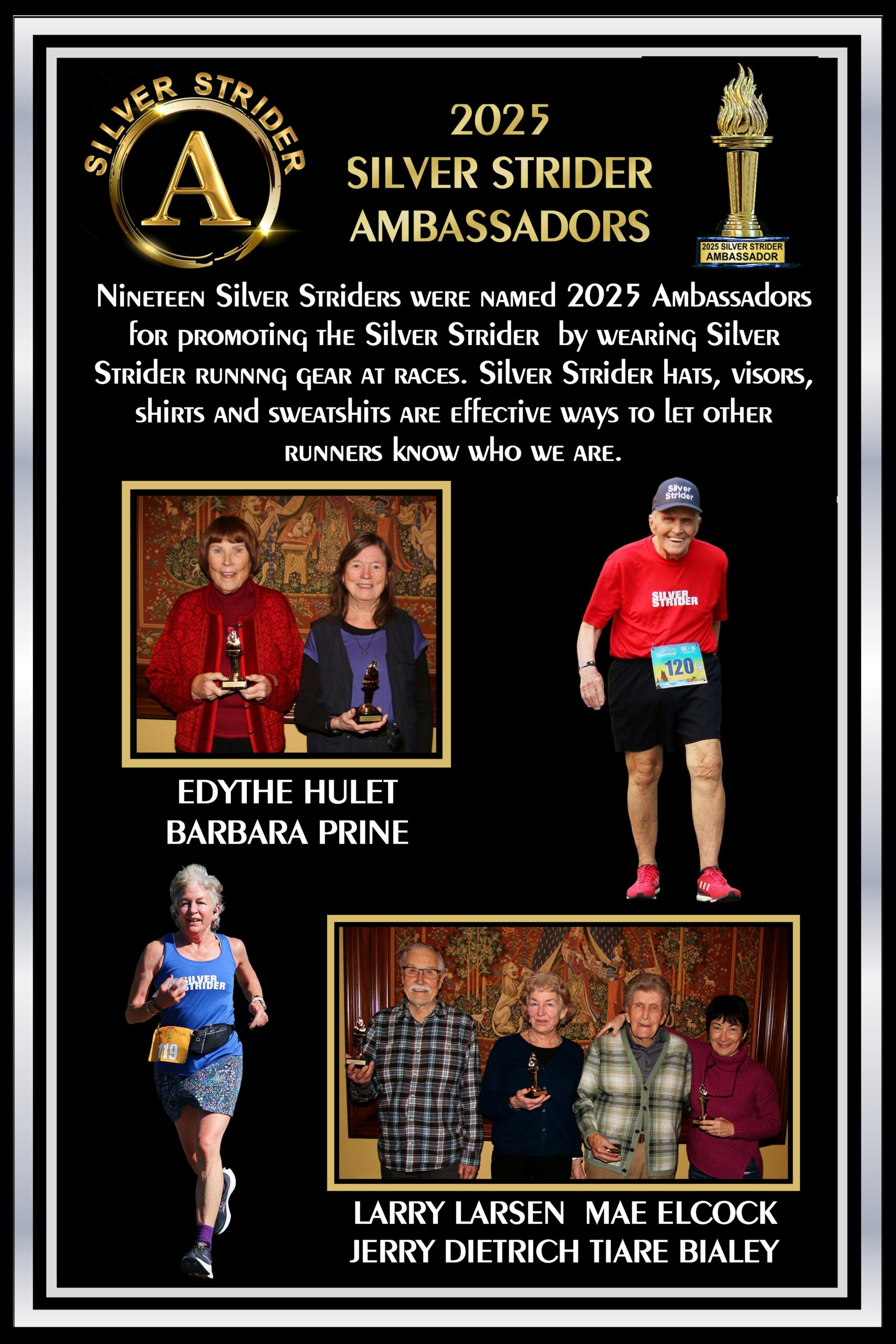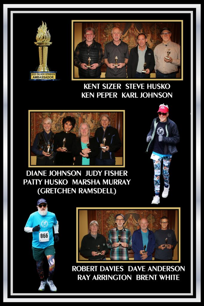 Next to be presented were the Achievement Awards. This year the achievement awards were given to those who worn a Silver Strider shirt, singlet, hat or visor to every series race they ran during 2025. The award was called an ambassadorship. The award consisted of an Olympic Torch trophy and a Olympic Torch lapel pin. Just like Olympic athletes competed as ambassadors of their respective countries, Silver Striders who wore the Strider apparel were ambassadors of the Silver Strider magazine.