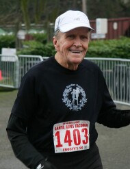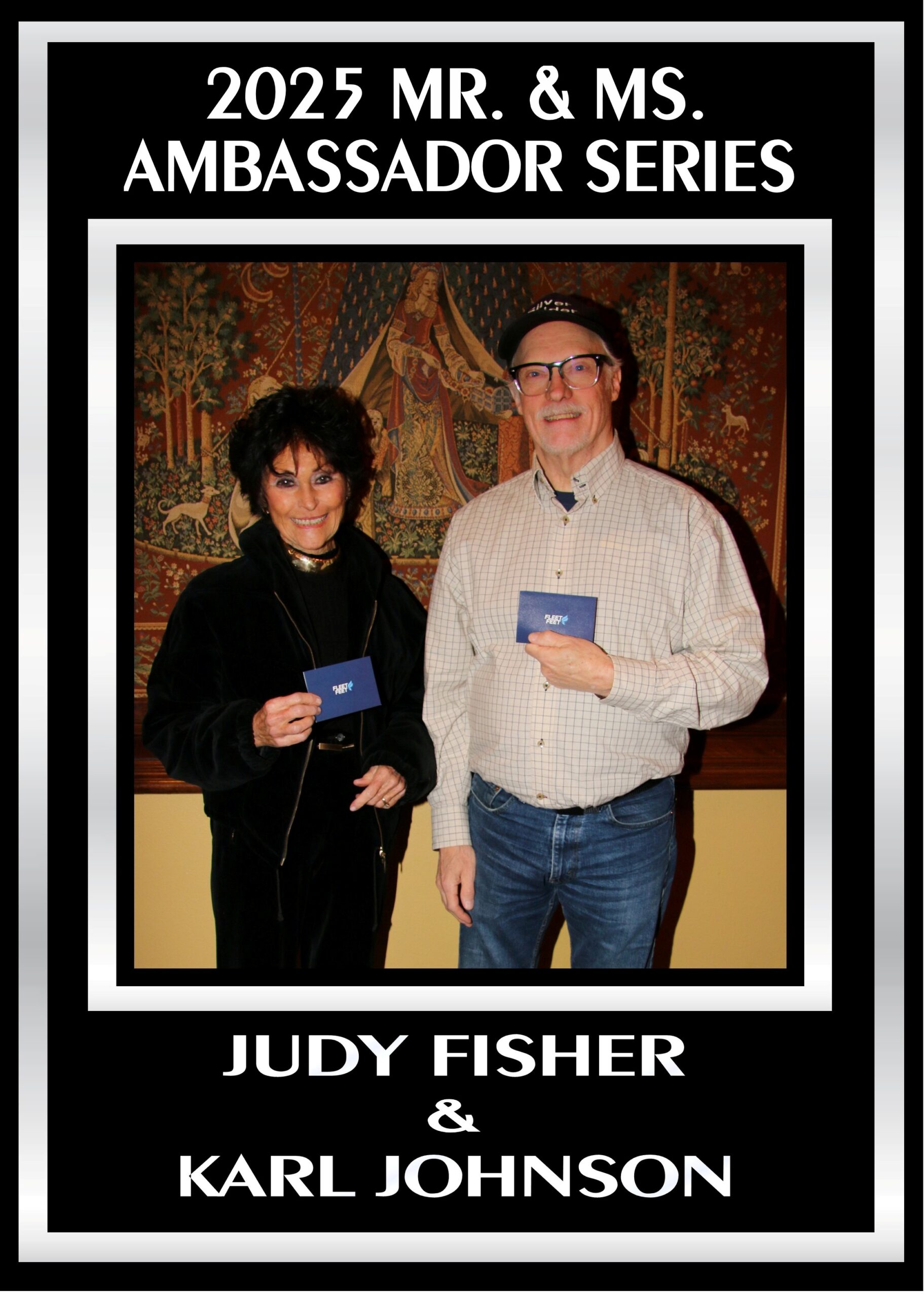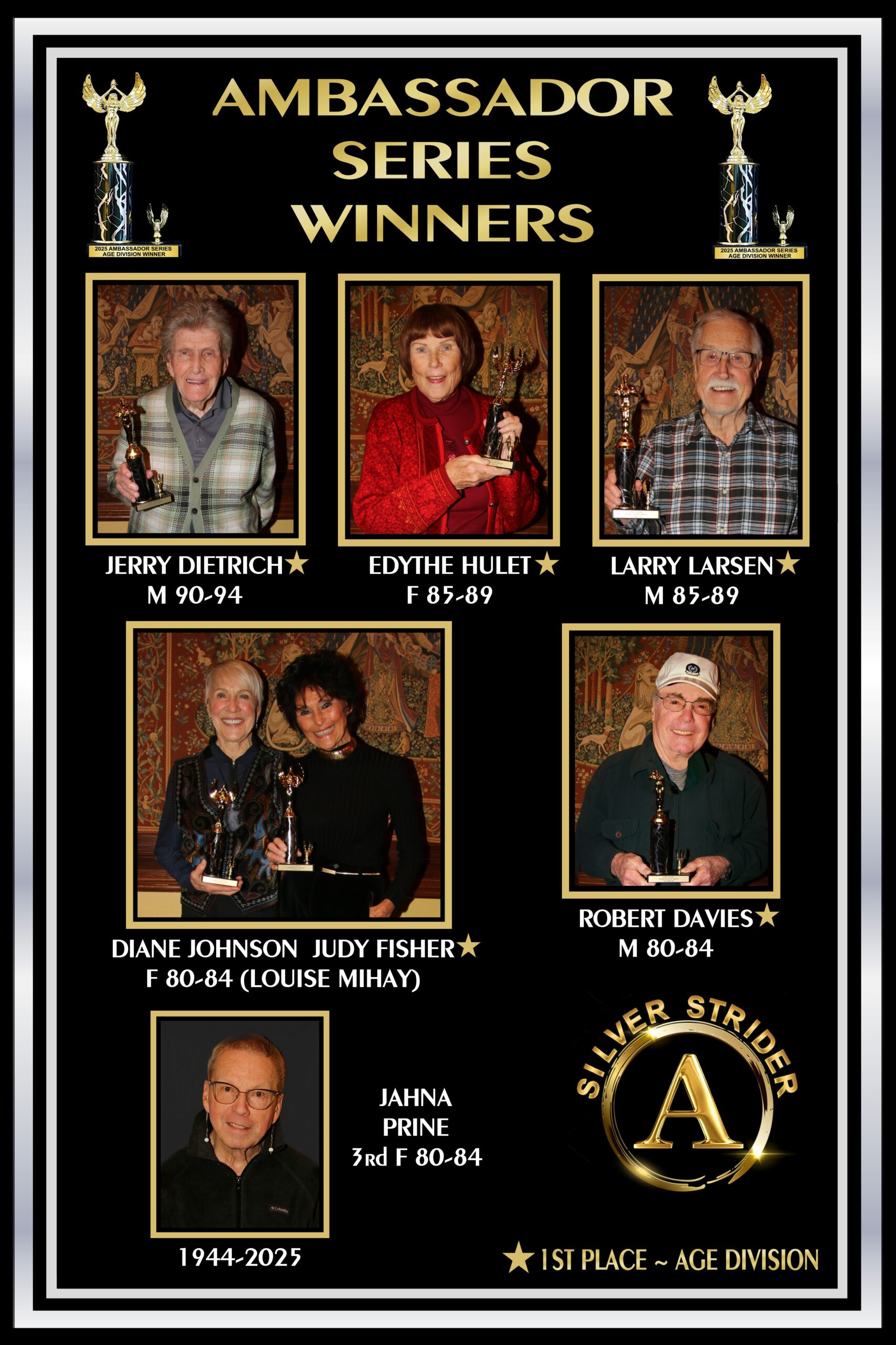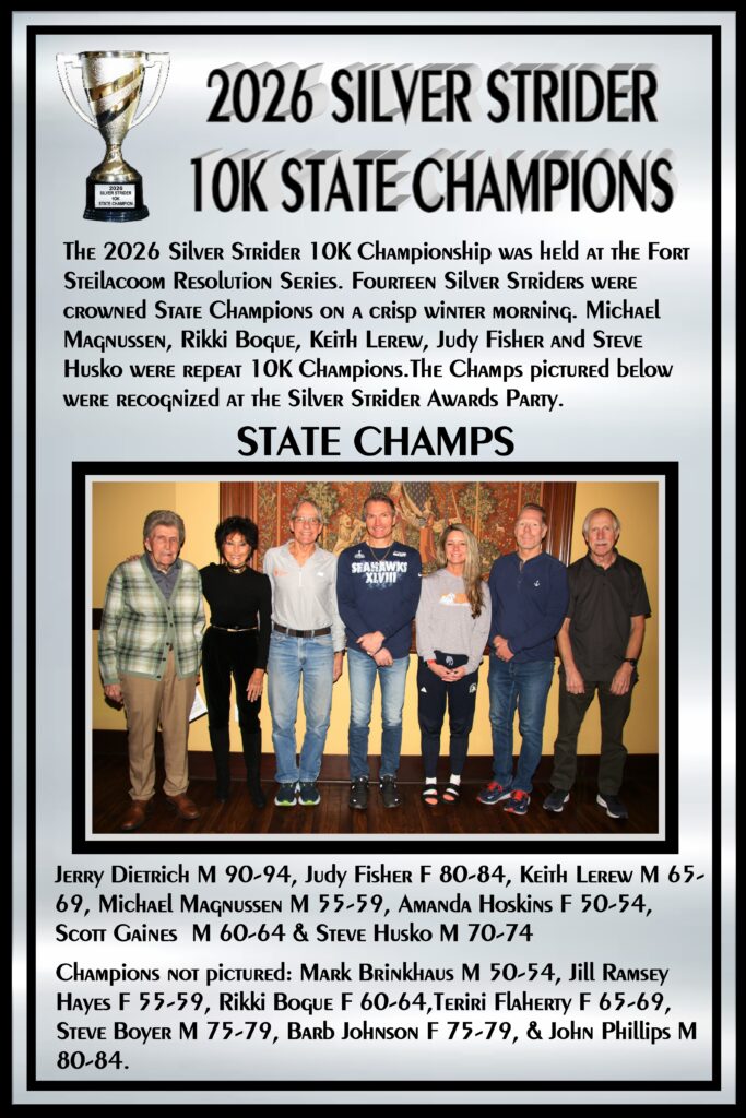 Next to be presented were the Achievement Awards. This year the achievement awards were given to those who worn a Silver Strider shirt, singlet, hat or visor to every series race they ran during 2025. The award was called an ambassadorship. The award consisted of an Olympic Torch trophy and a Olympic Torch lapel pin. Just like Olympic athletes competed as ambassadors of their respective countries, Silver Striders who wore the Strider apparel were ambassadors of the Silver Strider magazine.