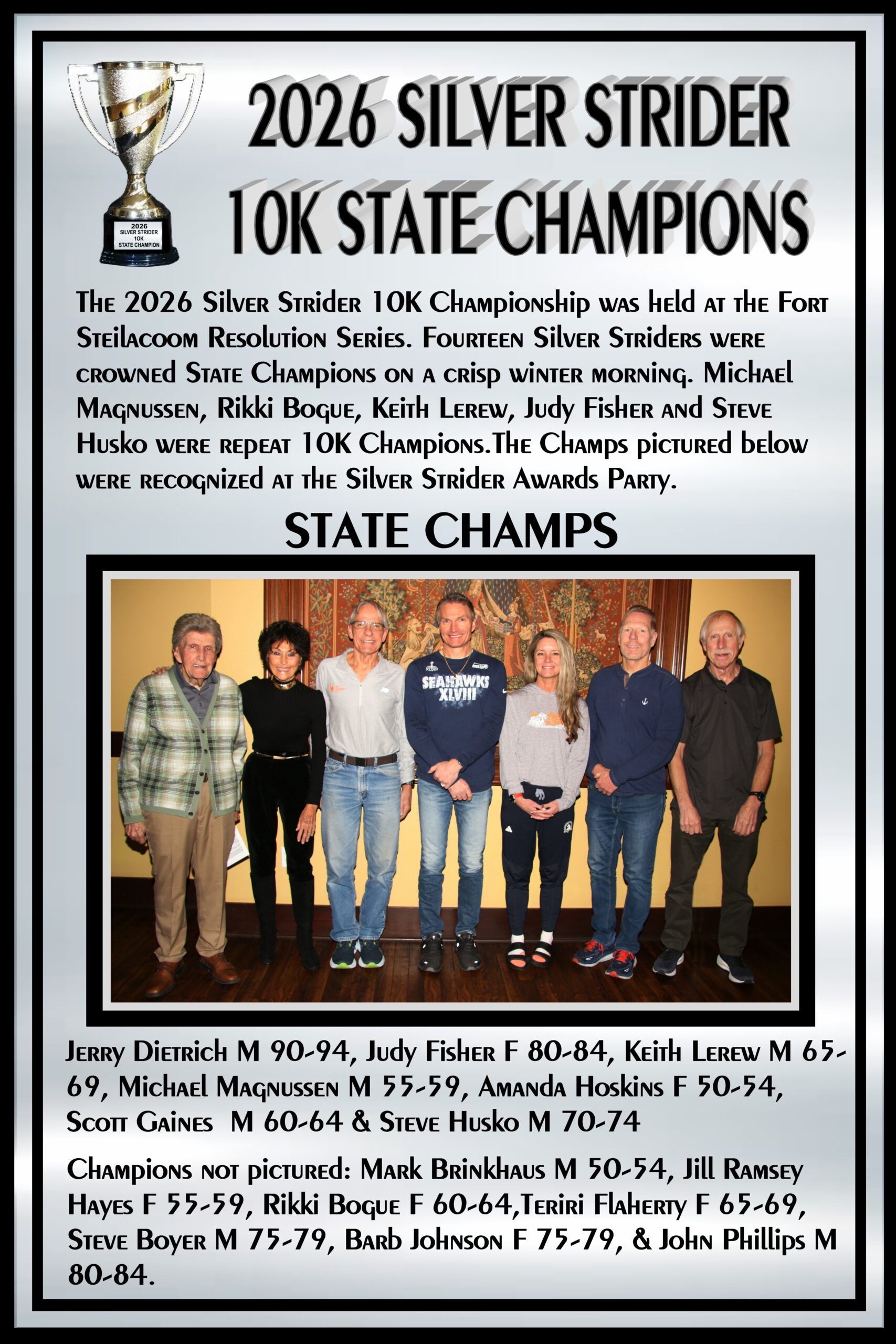 I introduced our 2026 10k Champions present. They were, Amanda Hoskins W50-54, Michael Magnussen M55-59, Rikki Bouge W60-64, Scott Gaines M60-64, Keith Lerew M65-69, Steve Husko M70-74, Barb Johnson W75-79, Steven Boyer M75-79, Judy Fisher W80-84, John Phillips M80-84 and myself M90-94.