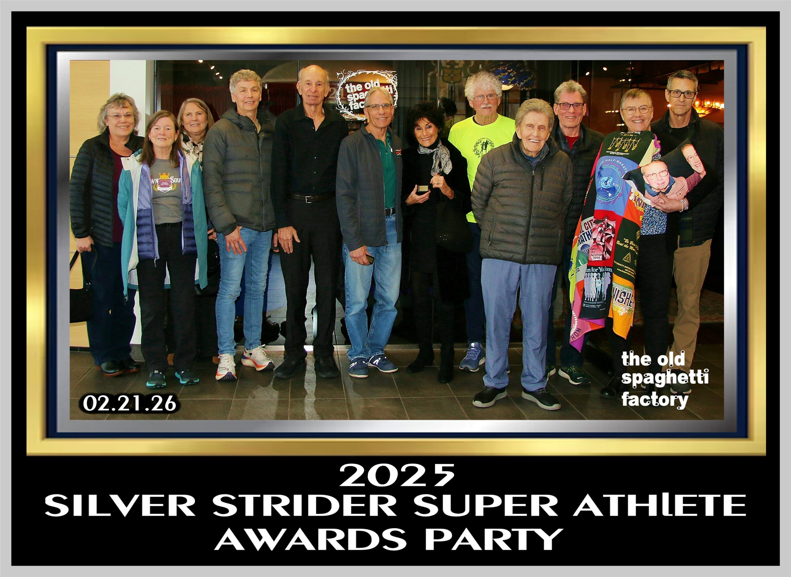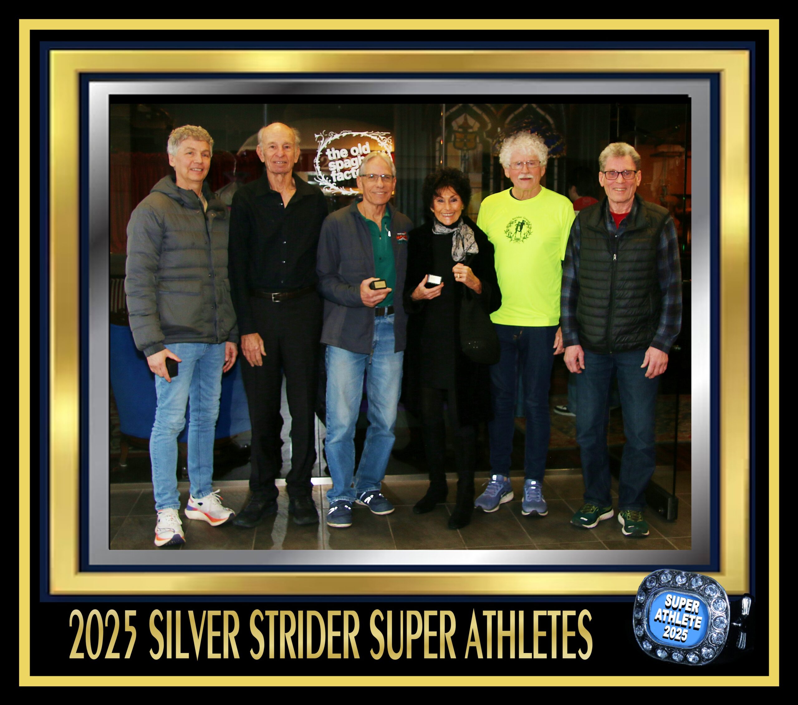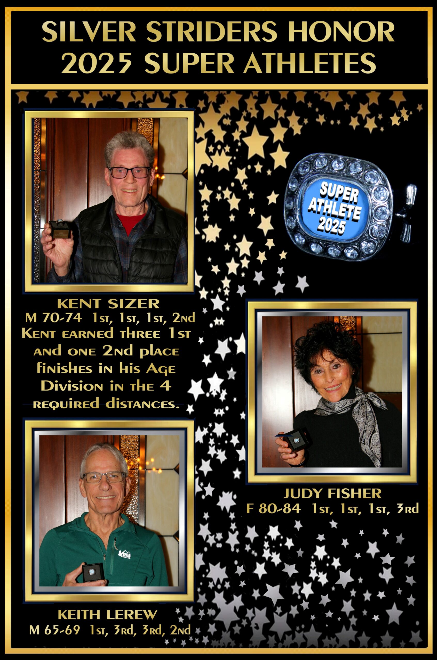 Our final Super Athlete at the party was Judy Fisher. Judy was receiving her 8th ring. After receiving her ring I announced that the ring was her 8th. She now had 2 gold and 6 silver. Judy barely missed a gold ring in 2025. She finished the year ranked #1 at 3K, #1 at 5k, #1at 5k and #3 at the Half Marathon. Judy made a few remarks about her plans to run in 2026.