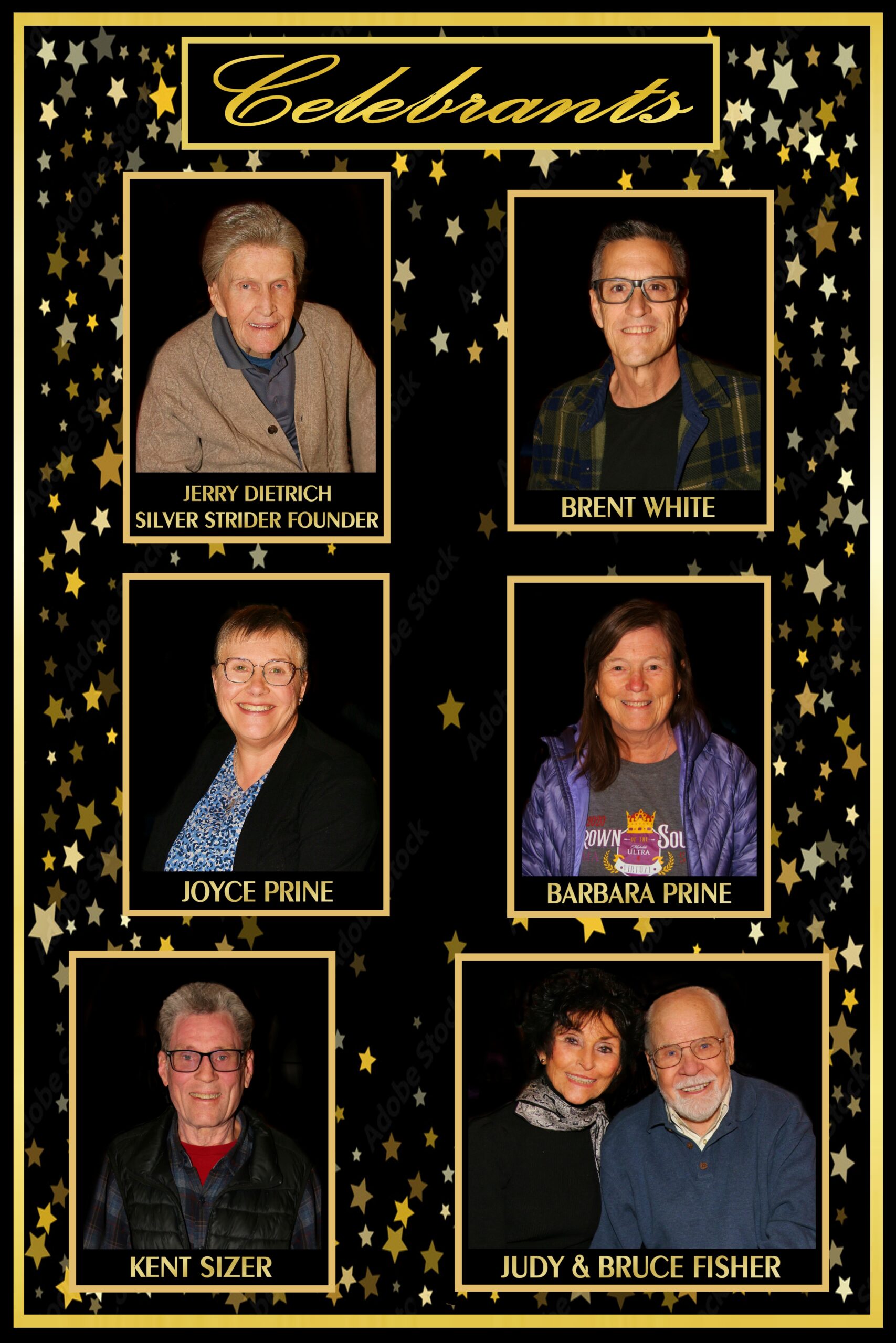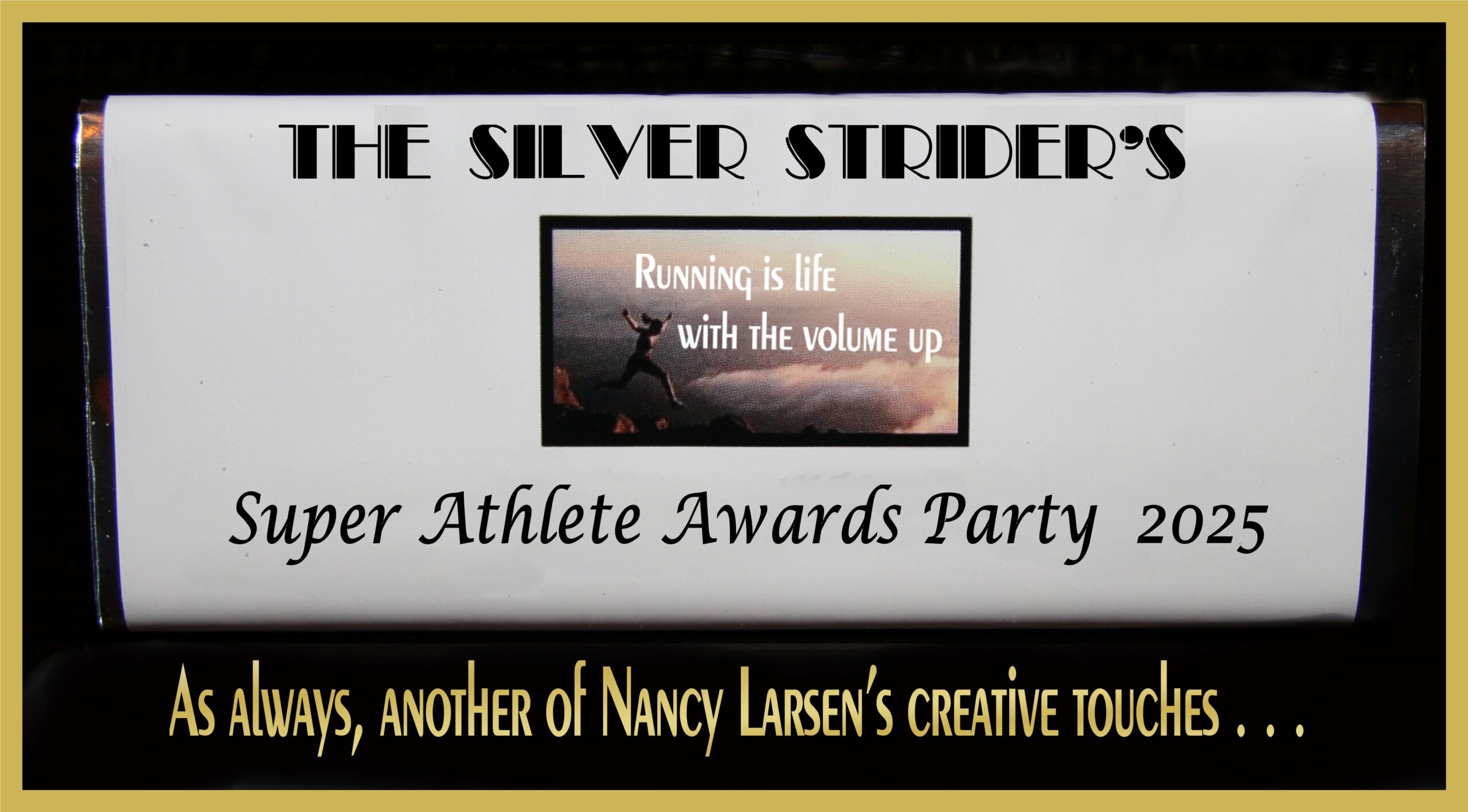 Next I introduced Bruce Fisher, creator of the Silver Strider Calendar. Bruce is the Silver Strider graphic artist and photographer of all our events. The program chairman, Michael Magnussen was absent, as were our TOP IO Chairmen except for Kent Sizer, the TOP IO Marathon Chairman. I introduced Kent and the others present who worked on the party. Diane Martin, the party Chairperson had to leave early, but not before she made sure everything was in order. Others who contributed were introduced. They were Brent White, Nancy Larsen and Larry Larsen. Nancy gave customized Hershey Bars to everyone present.