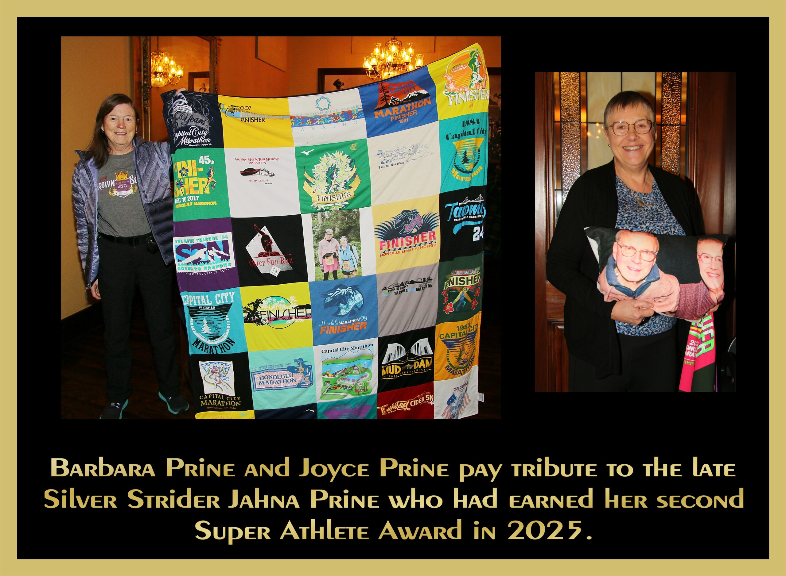 Our first ring was presented posthumously to Jahna Prine, who died in a household accident a few weeks earlier. Accepting the ring was Joyce Prine, Jahna’s surviving spouse and Jahna’s sister, Barbara Prine. It was Jahna’s 4th super Athlete ring.