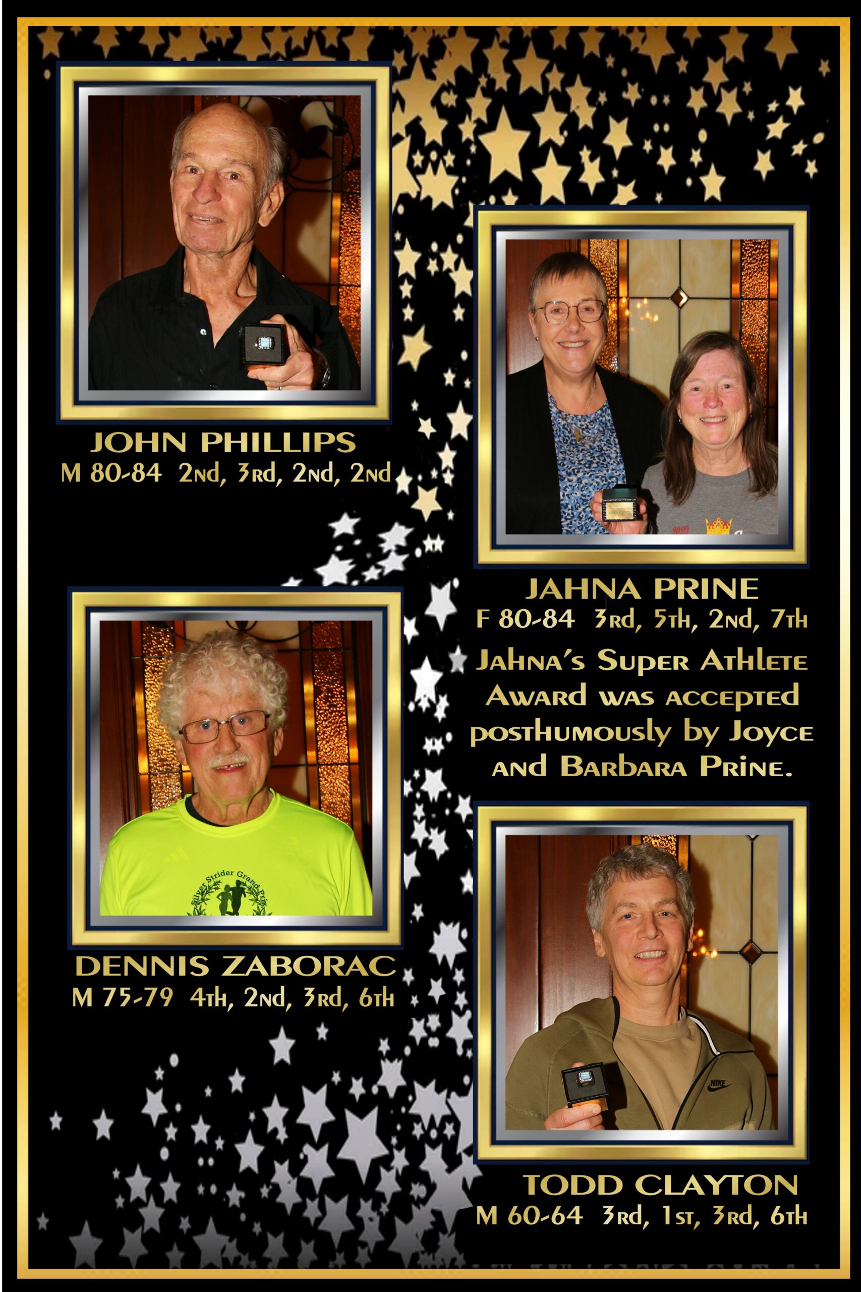 Our next Super Athlete was John Phillips. John was receiving the 5th ring. He finished 2025 ranked #2 at 3k, #3 at 5k, #2 at 10k and #2 at the Half Marathon. Three #2’s and one #3, was near gold ring country. John talked about his injury and how his recovery has been going well.