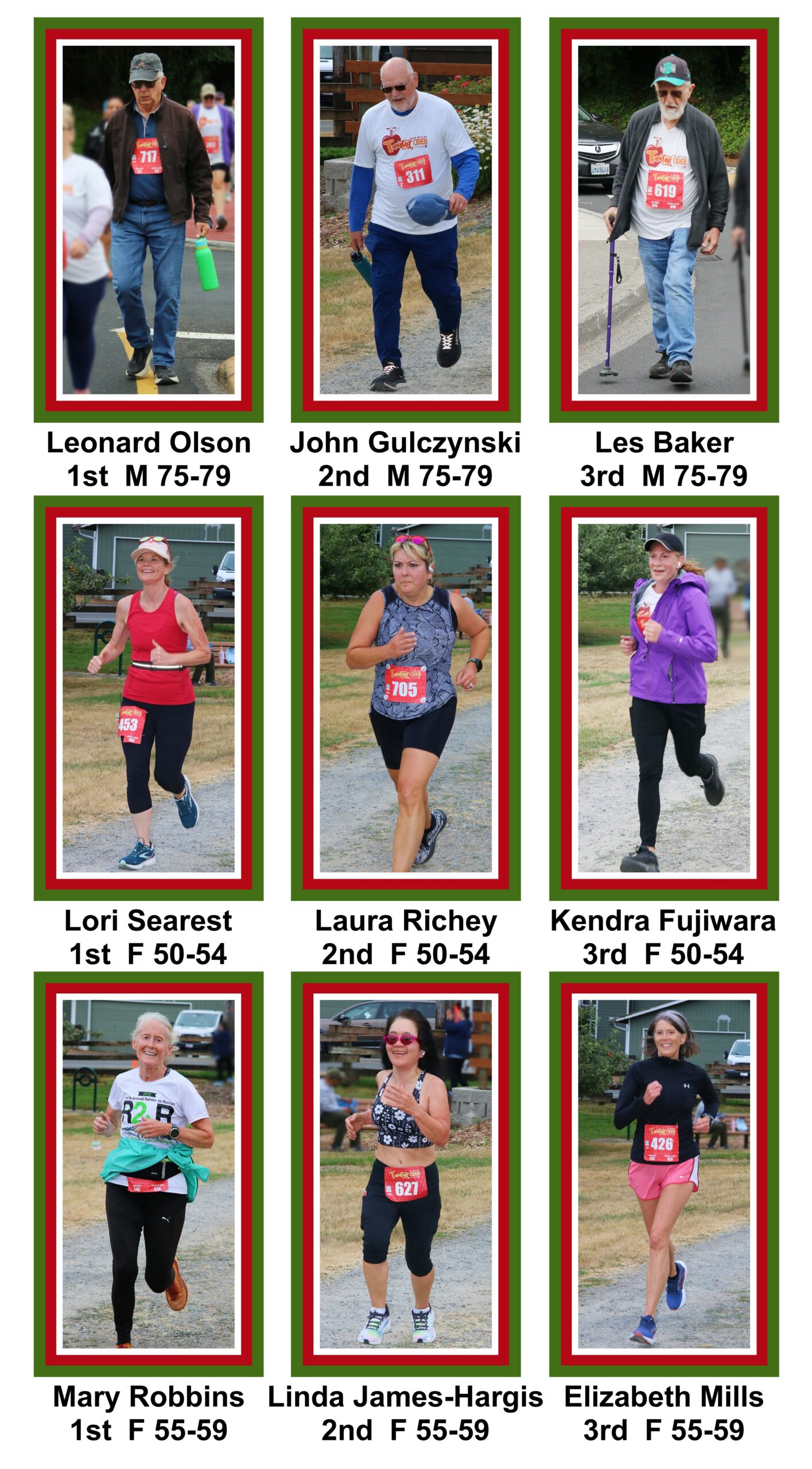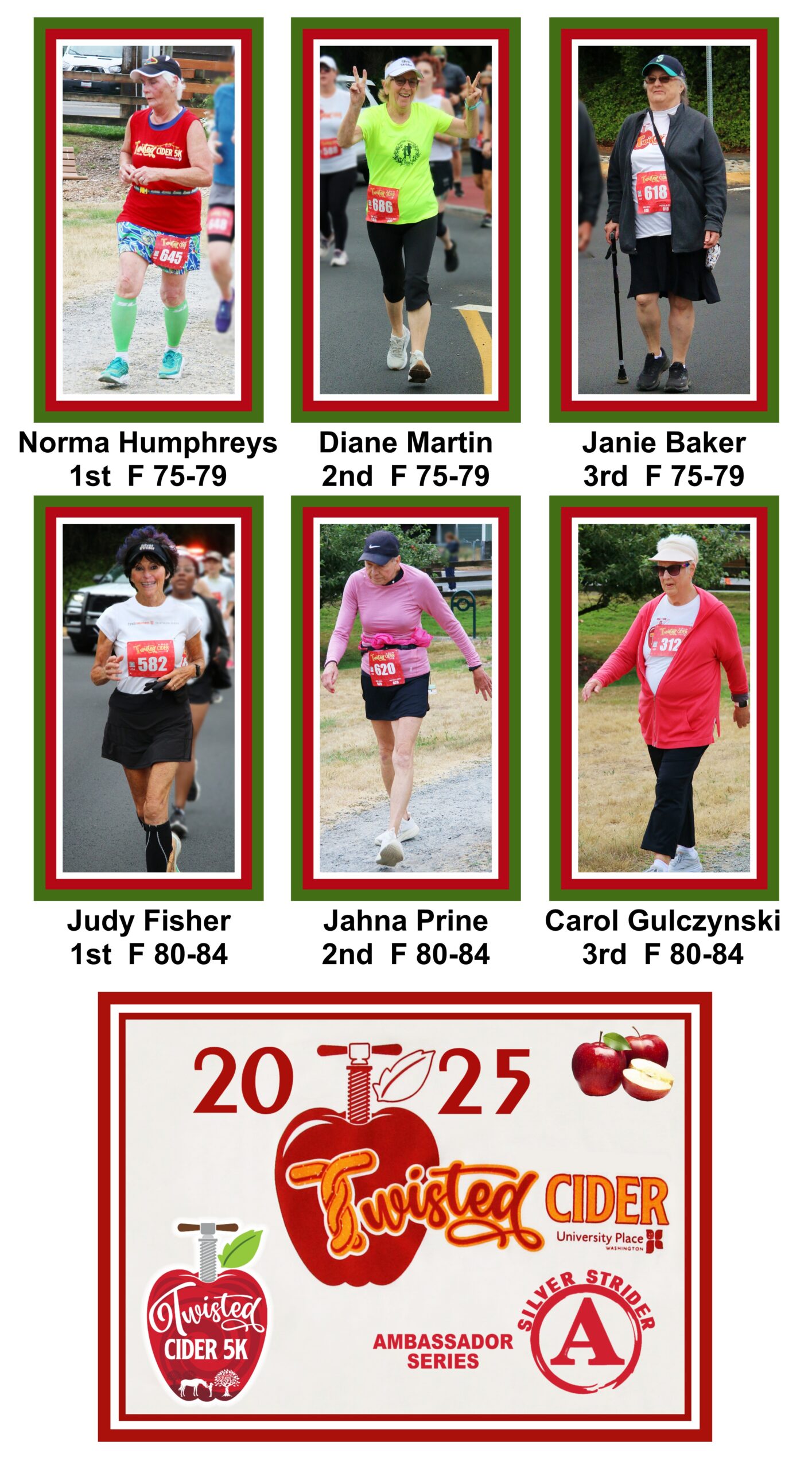 The first Silver Strider to finish was Ken Reitan in 22:09. The first female Silver Strider to finish was Mary Robbins in 24:13