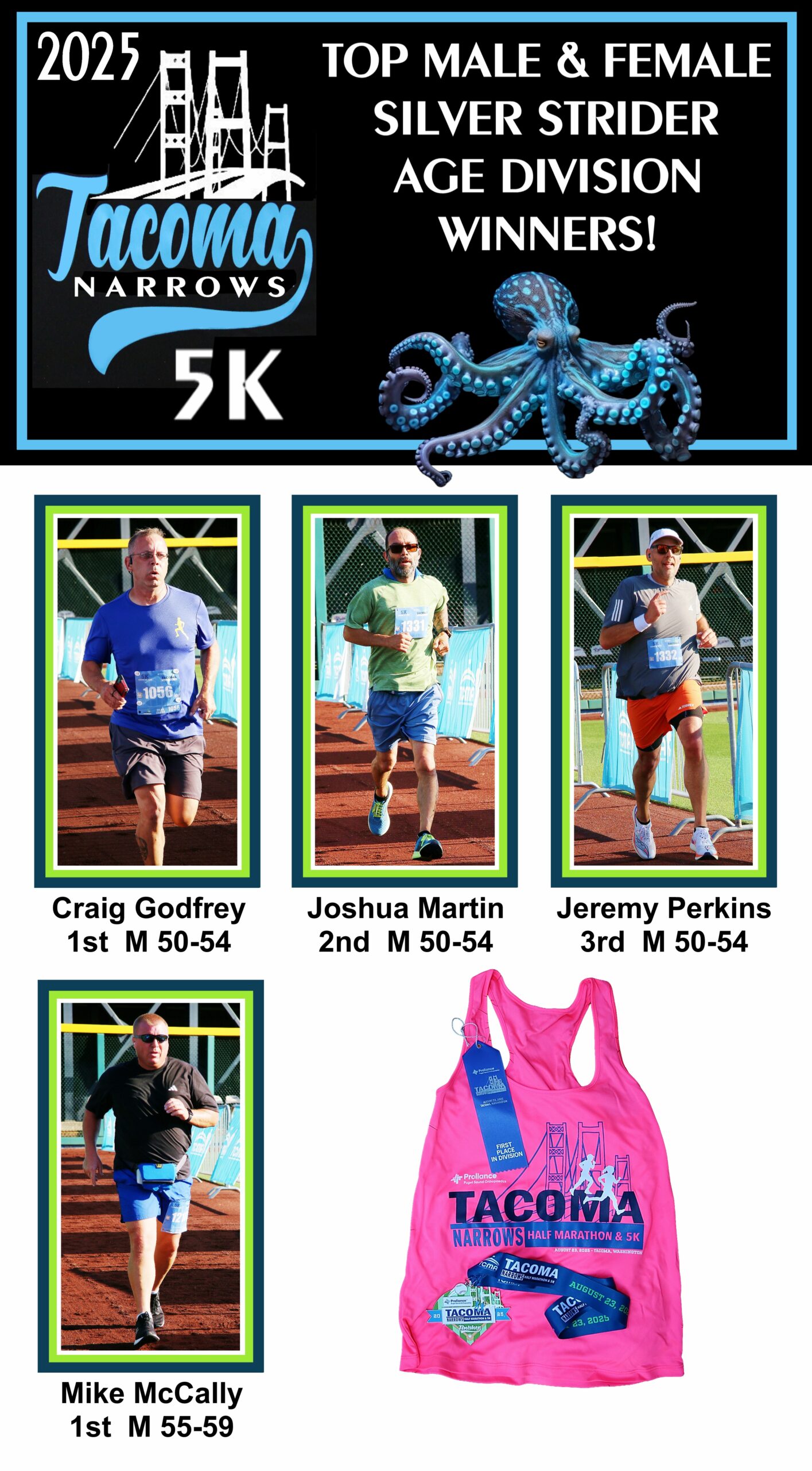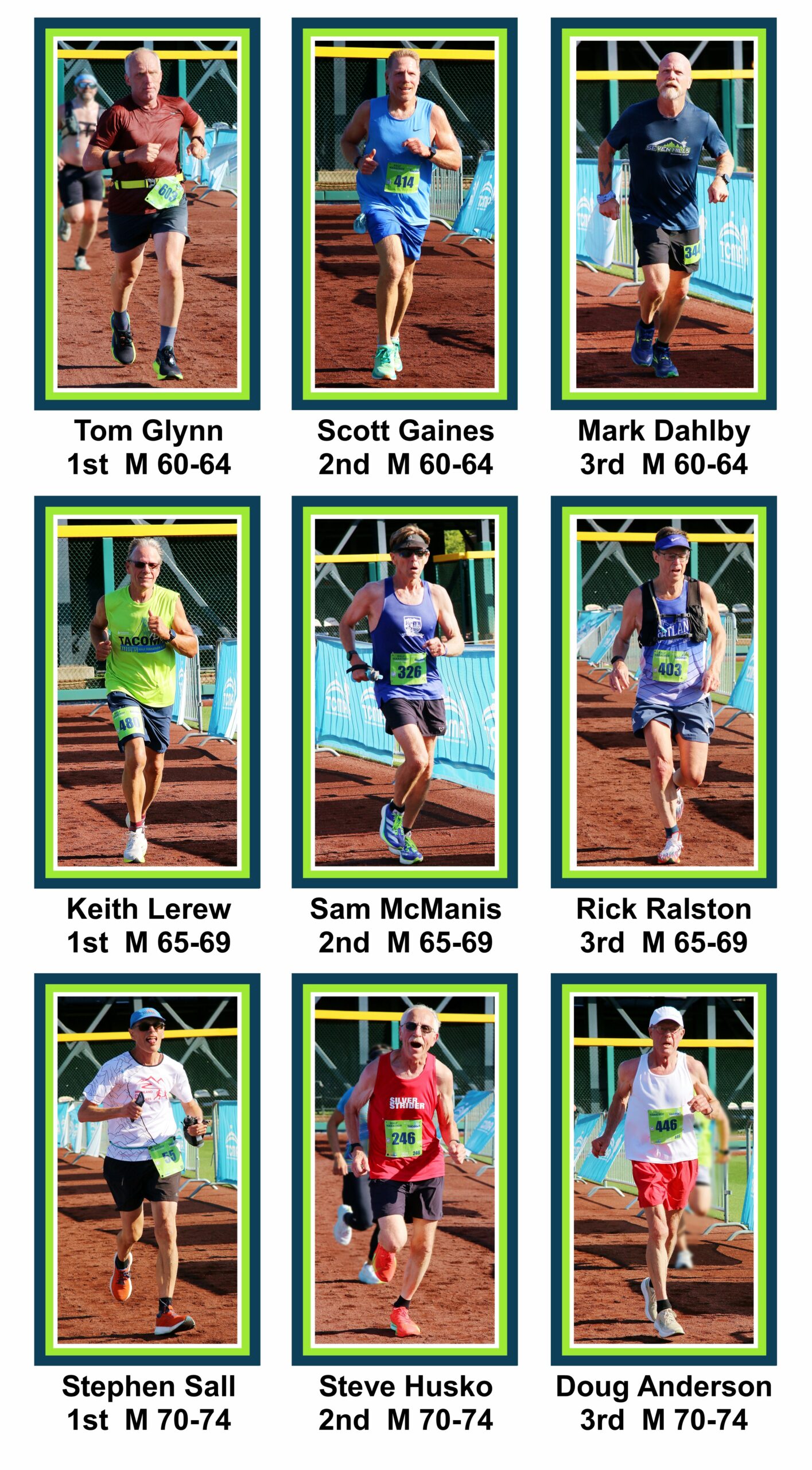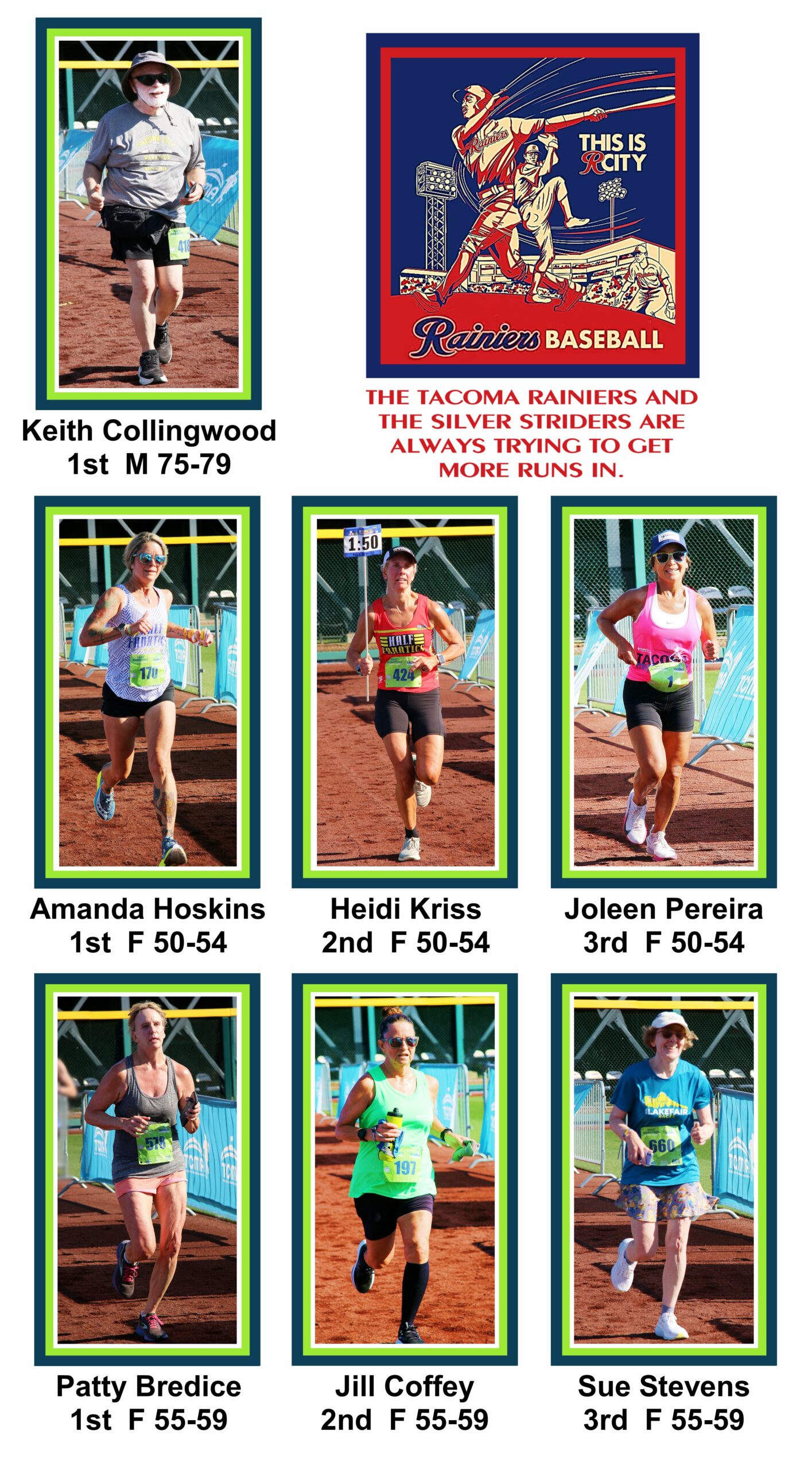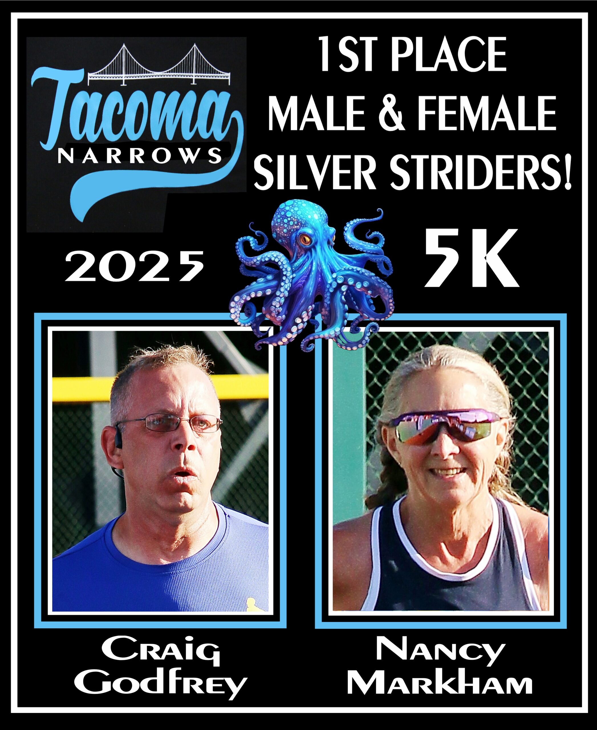 The 5k course is a convoluted loop. Larry Scott to Orchard, right on 19th and right again on Stevens returning to Cheney stadium. The first Silver Strider to finish was Craig Godfrey, age 53 in 23:35. The first female Silver Strider to finish was Nancy Markham, age 62, in 24:46.