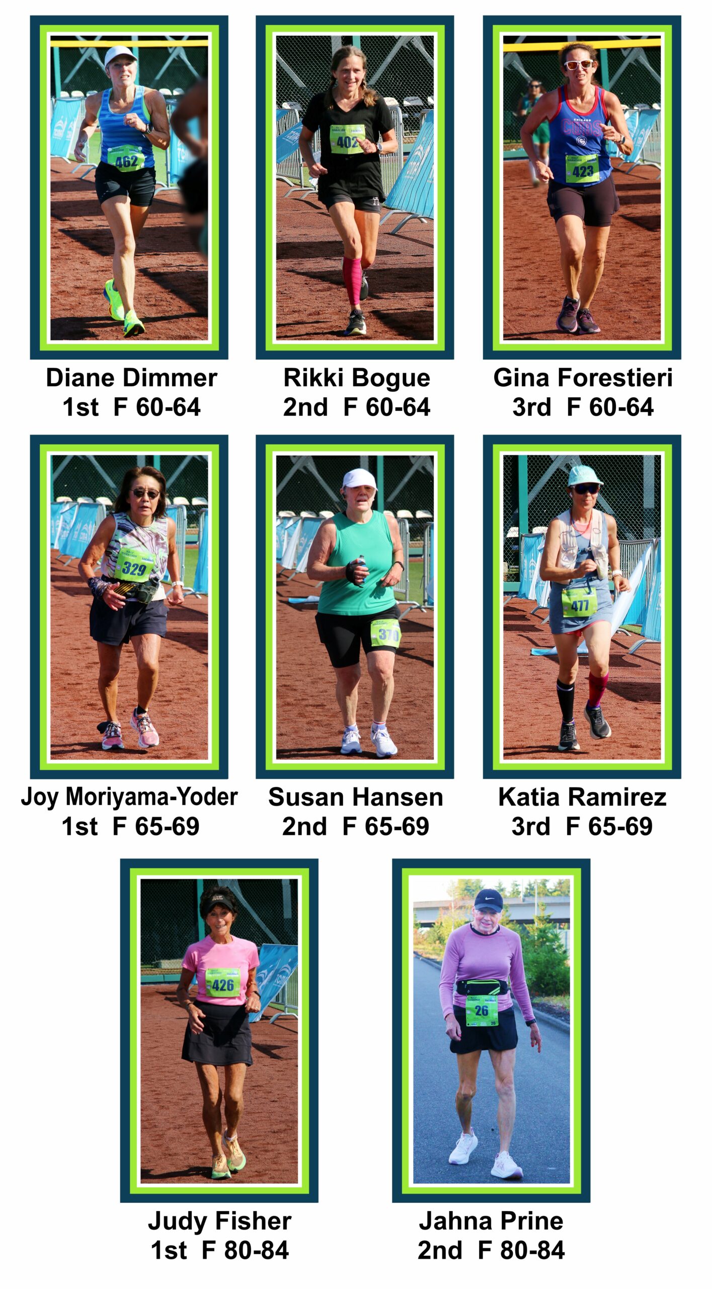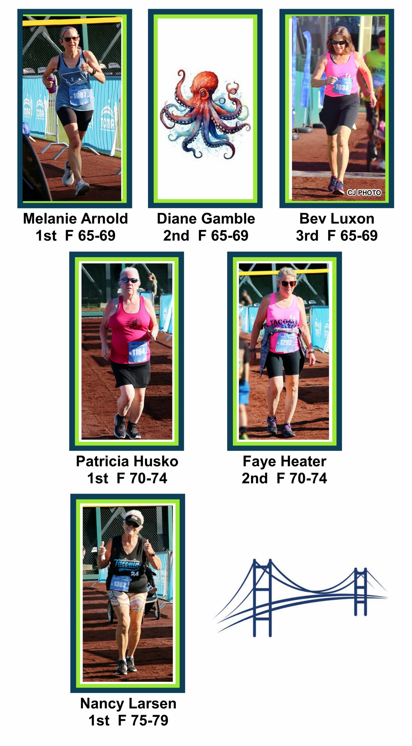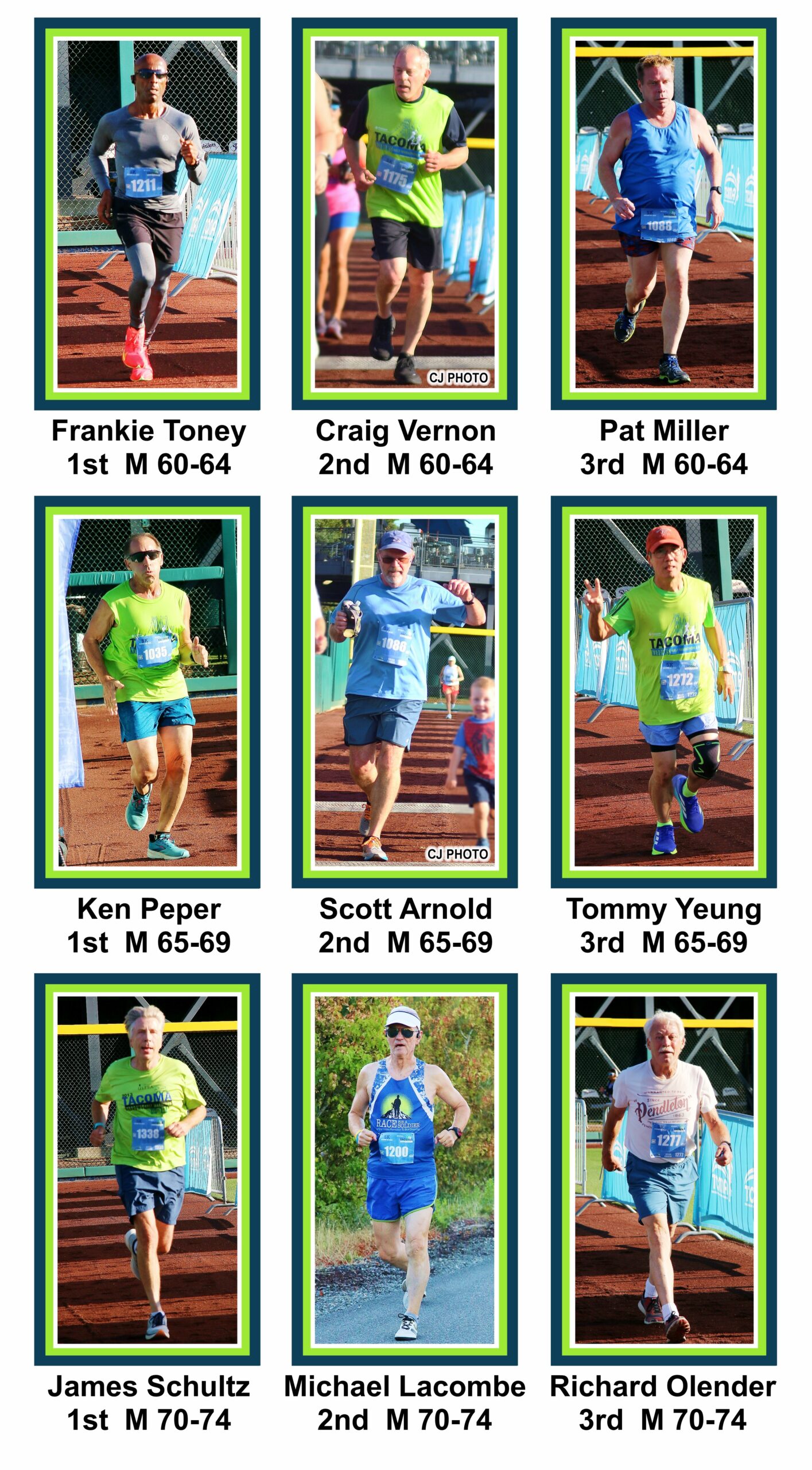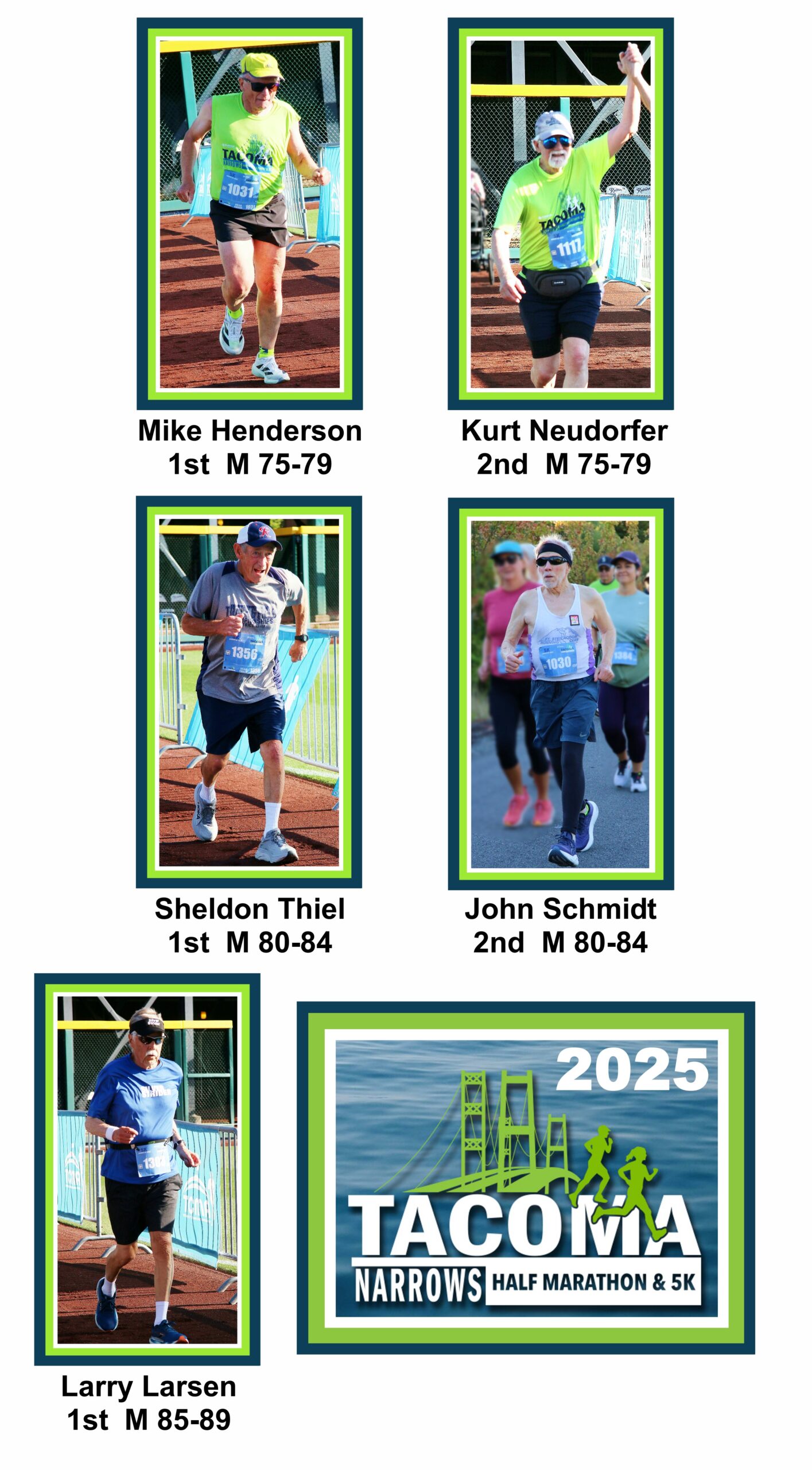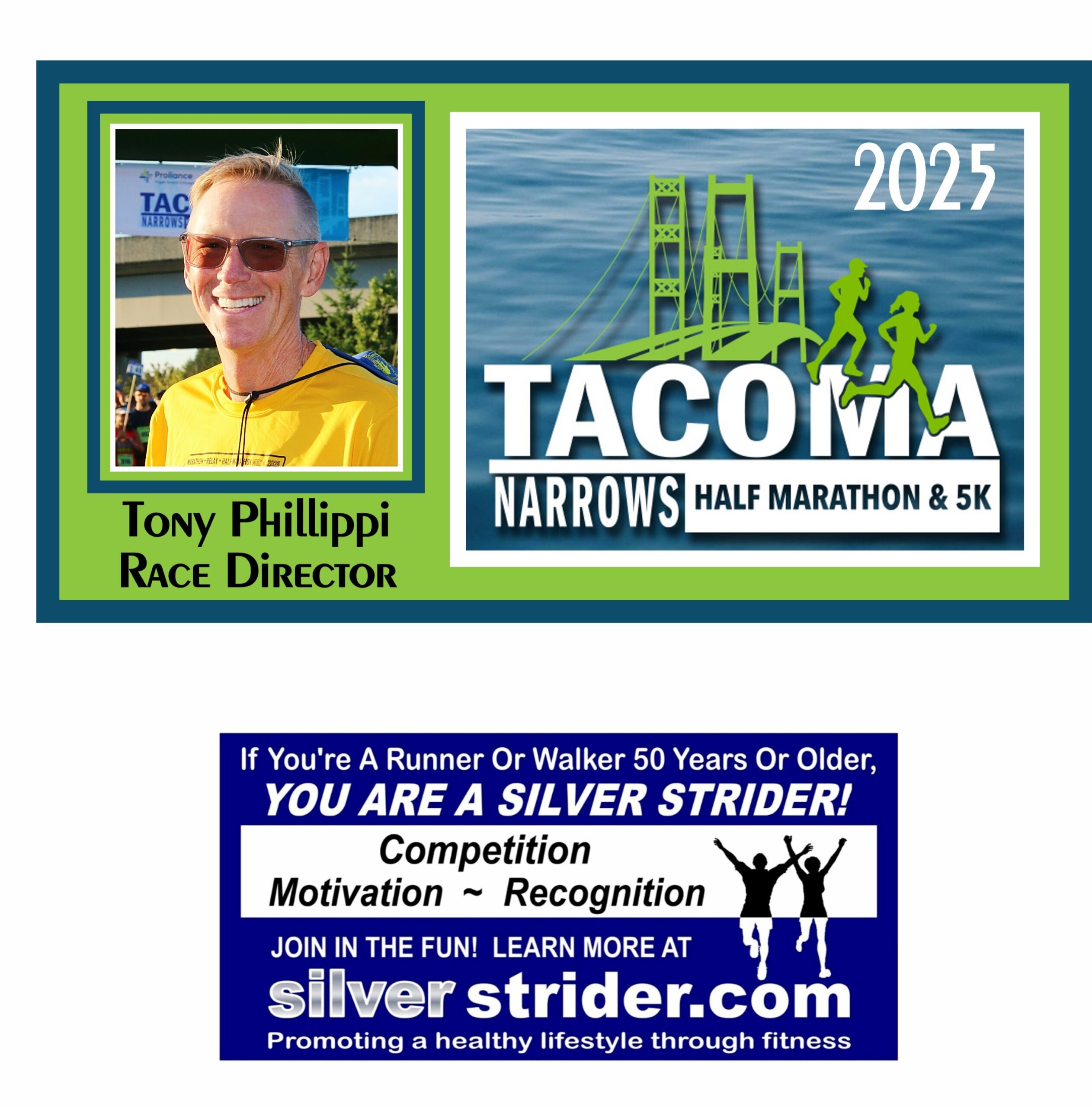 The 5k course is a convoluted loop. Larry Scott to Orchard, right on 19th and right again on Stevens returning to Cheney stadium. The first Silver Strider to finish was Craig Godfrey, age 53 in 23:35. The first female Silver Strider to finish was Nancy Markham, age 62, in 24:46.