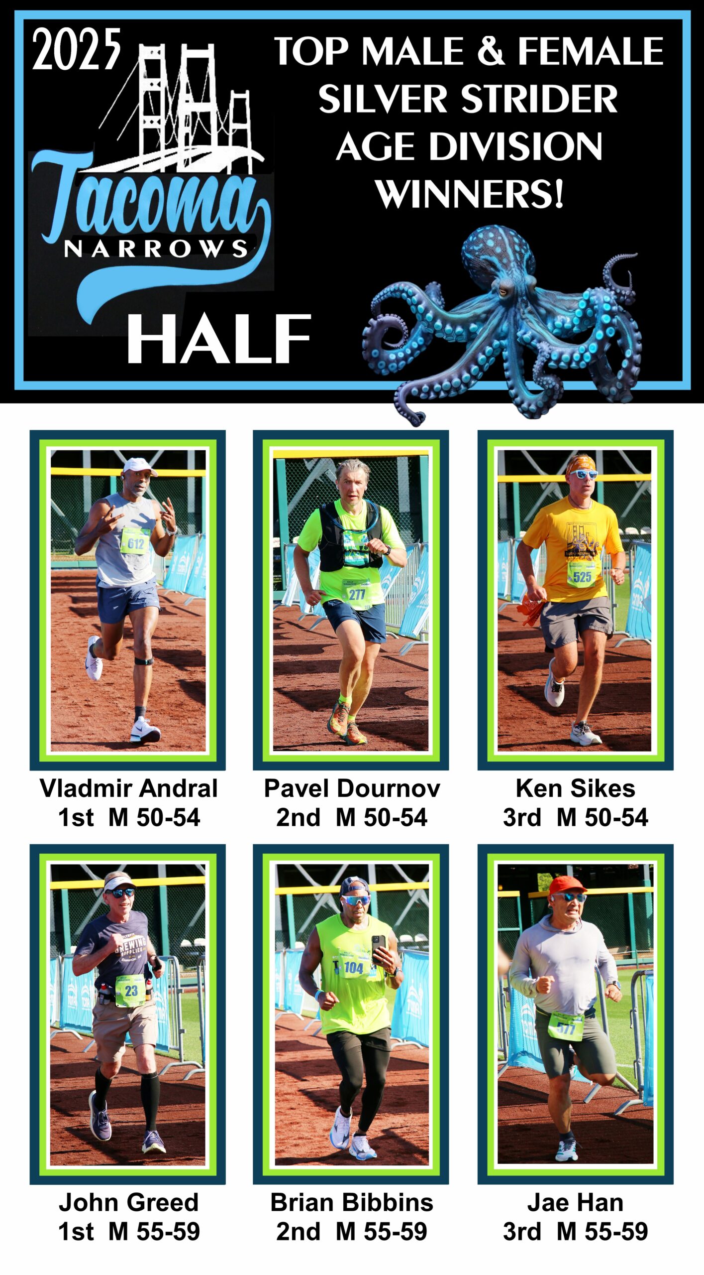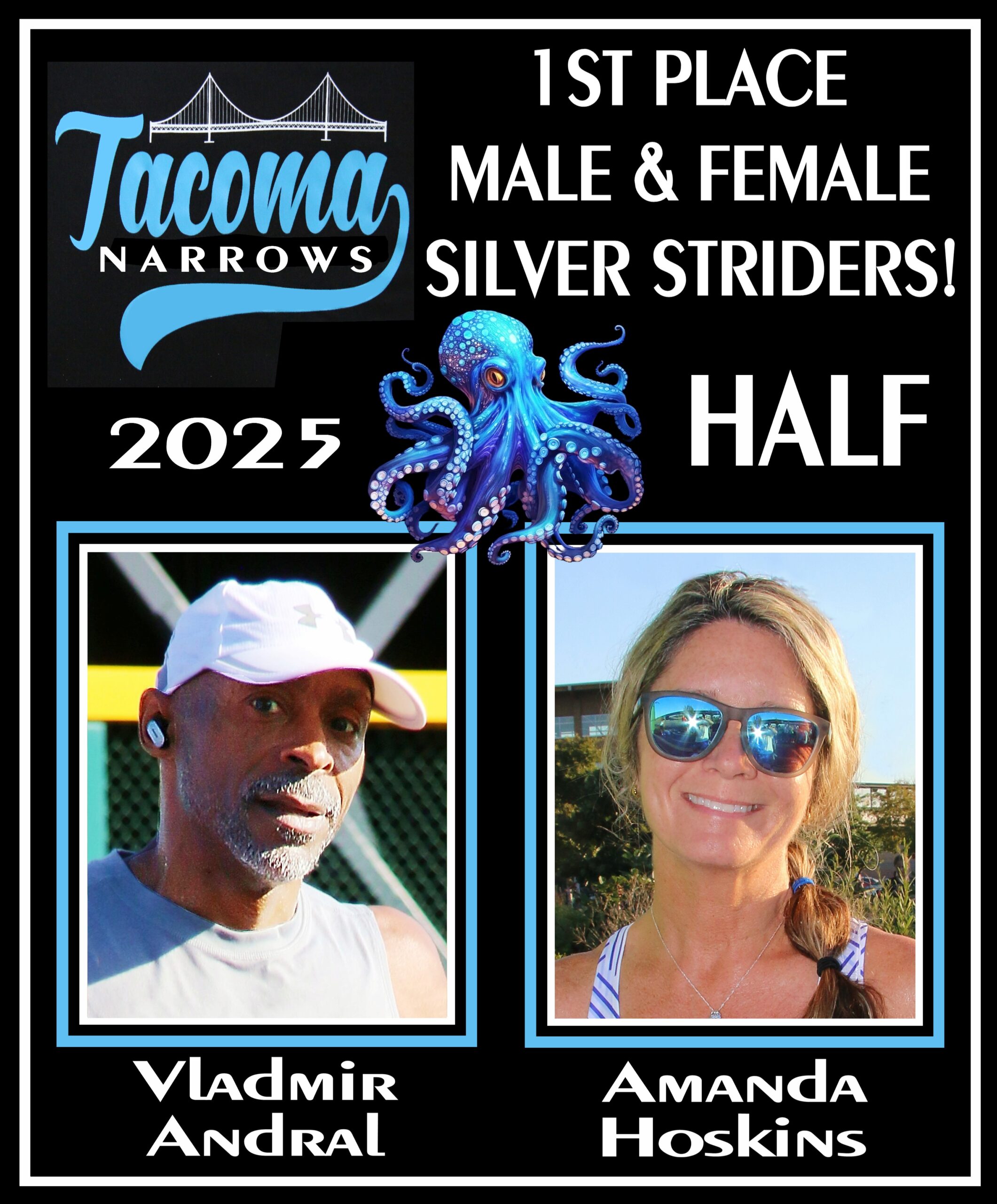 The first Silver Strider to finish the Half Marathon was Vladmir Andral, age 52, in 1:42:21. The first Silver Strider female to finish the Half Marathon was Amanda Hoskins, age 51, in 1:45:01 .