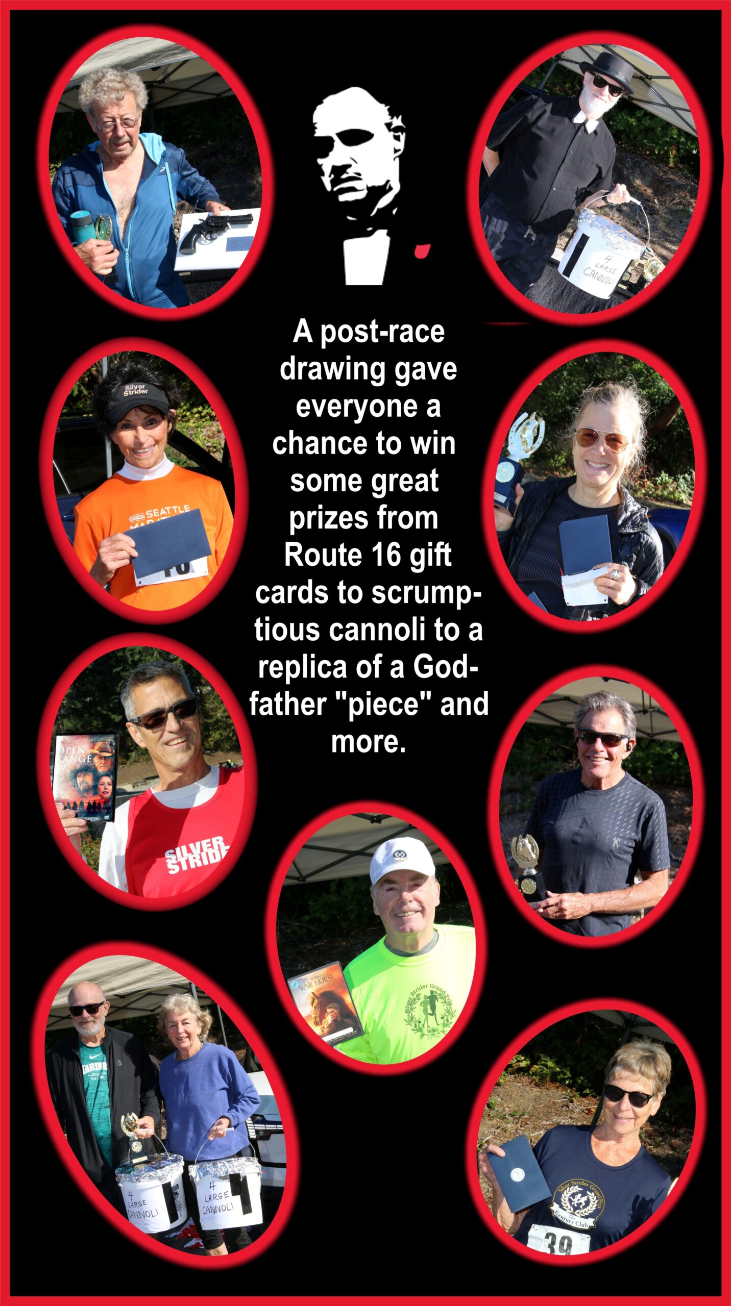 This was a race I couldn’t refuse. I love the Godfather movies so I couldn’t pass this one up. It was a small intimate turnout on the usual 3k course, just a little bit longer. There were some great drawing prizes after as well. I ended up “leavin’ da gun and takin’ da cannoli.” And, man, was that a tasty cannoli! Afterwards a few of us gathered at Moctezuma’s for lunch. A great time and another beautiful day for a race.